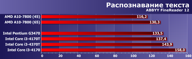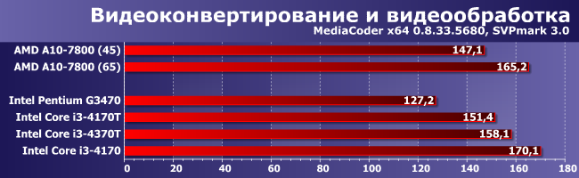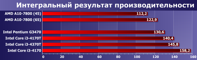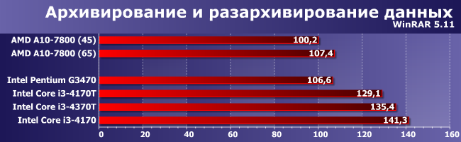 Меньше требований к графическому ядру, хуже реализована поддержка многопоточности, так что тут всем сложно конкурировать даже с Pentium. Но «хуже» — не значит «отсутствует», так что Core i3 все же быстрее. Любопытным является тот факт, что в случае А10 «заужение» теплопакета на 20 Вт приводит к снижению производительности на 12%, а для Core i3 (если сравнивать 4170 и 4170Т) — на 14%, но и теплопакет уменьшается не на 20, а на 18 Вт. В общем, Kaveri в плане масштабирования по теплопакету ничуть не уступает (а то и превосходит) даже Haswell — для чего и создавался. Жаль только, конечно, что абсолютные показатели производительности в его случае ниже.