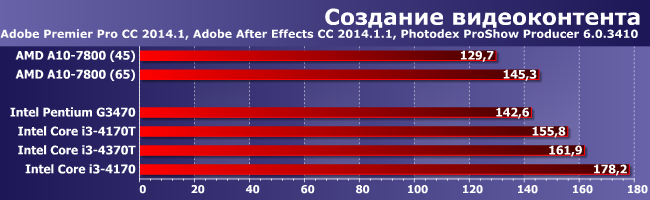 Оба приложения, входящие в группу, «нагружают» все процессорные ядра, а второе еще и существенно зависит от производительности GPU, поэтому явными аутсайдерами здесь являются Pentium (ну и Celeron), а вот выше — не все однозначно. Лучший процессор AMD с TDP 45 Вт уже стабильно отстает от Core i3-«Т», и исправить положение можно лишь расширением теплопакета; читай — более мягкими условиями эксплуатации. Однако не слишком, поэтому, хотя А10-7800 и быстрее здесь, чем «Т»-семейство, от старших регулярных Core i3 он уже отстает, хотя теплопакет последних все равно ниже. А наиболее интересным с точки зрения внутрифирменной конкуренции является здесь то, что энергоэффективные Core i3 намного быстрее «обычных» Pentium.