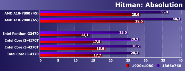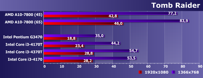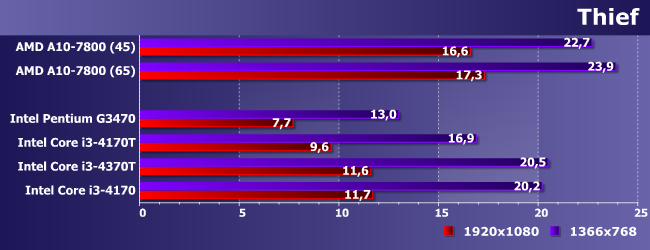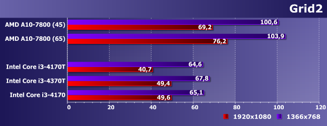 Если на А10 можно играть и в FullHD, то на Core i3 — только играть, а Pentium не спасает даже снижение разрешения: как и предполагалось. Интересным является разве что то, что 4170 медленнее, чем 4370Т, но это объяснимо: теплопакет задается для всего процессора, так что при снижении выделения тепла от процессорных ядер (путем снижения их частоты), графике достается больше (а Turbo Boost поддерживается GPU всех процессоров Intel — независимо от линейки). Такое мы увидим еще не раз, но уже не будем подробно останавливаться на этом моменте.